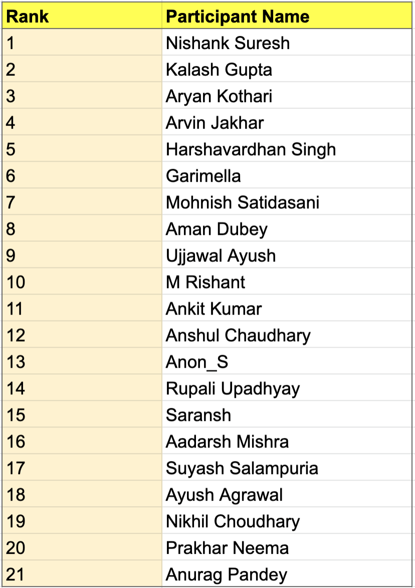 Scoring Criteria: Participants will be ranked based on the sum of scores of all the attempted problems. If the score is the same for two participants, then the participant with less time to solve problems will be ranked better.